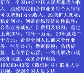 人進(jìn)寶城全國(guó)招商;合作業(yè)務(wù)減免廣告費(fèi)用;歡迎全國(guó)涉稅企業(yè)前來(lái)合作;業(yè)務(wù)合作電話(huà) 18038044059 聯(lián)系人羅廷剛